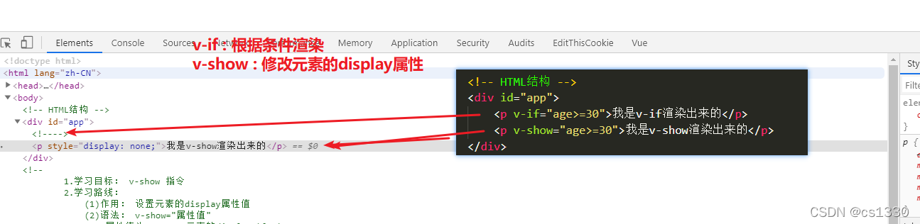 v-if | 根据条件渲染数据 | v-if="score>=90" | 无 | v-show | 设置元素的display | v-show="age>=30" | 无 | v-clock | 设置元素vue加载前的默认样式 | <p v-clock>{{msg}}</p> | 无 | v-once | 设置元素只能被vue渲染一次 | <p v-once>{{msg}}</p> | 无 | v-pre | 让元素不被vue渲染 | <p v-pre>{{msg}}</p> | 无 | ## 1.1-v-if指令 | | |