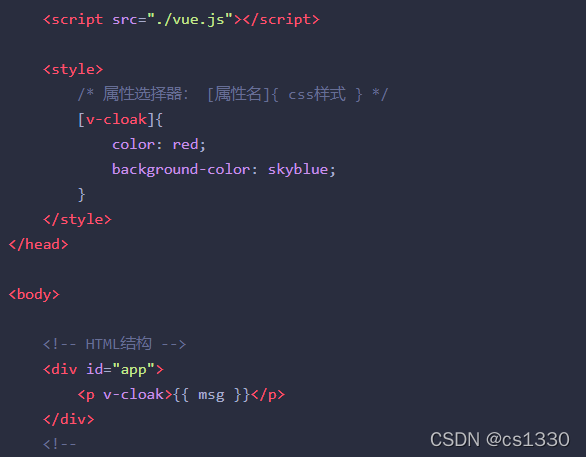 3、原理:v-cloak本质上就是一个属性选择器,vue在页面完全加载完的时候会移出整个自定义属性