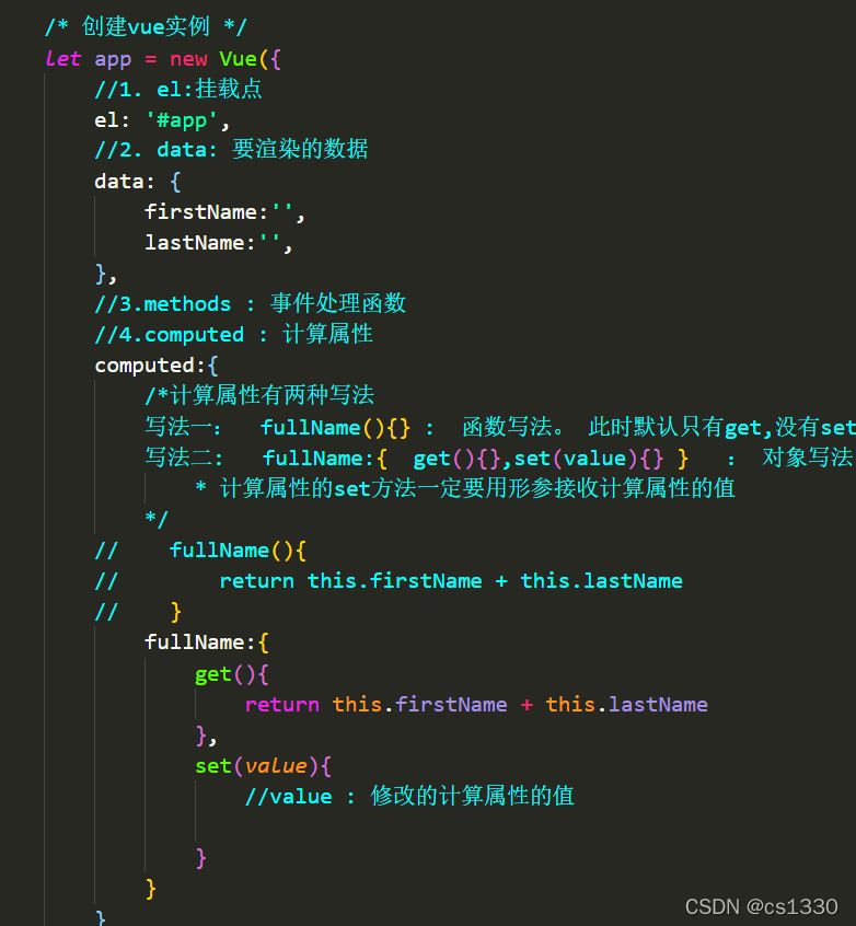 写法而:对象写法,计算属性的set方法一定要用形参取接收计算属性的值