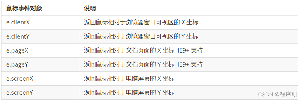 官方解释:event 对象代表事件 盘按键的状态、鼠标的位置、鼠标按钮的状态。 简单理解:事件发生后,跟事件相关的一系列信息数据的集合都放到这个对象里面,这个对象就是事件对象 event,它有很多属性和方法。