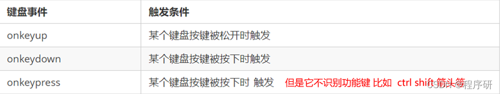 - on onkeypress 和前面2个的区别是,它不识别功能键,比如左右箭头,shift 等。