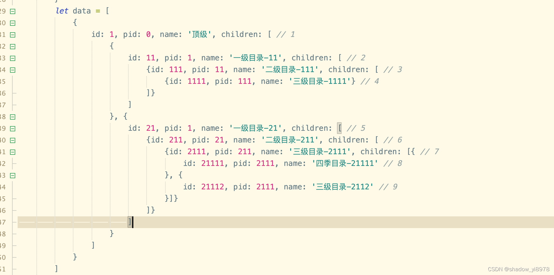id: 21, pid: 1, name: '一级目录-21', children: [ // 5