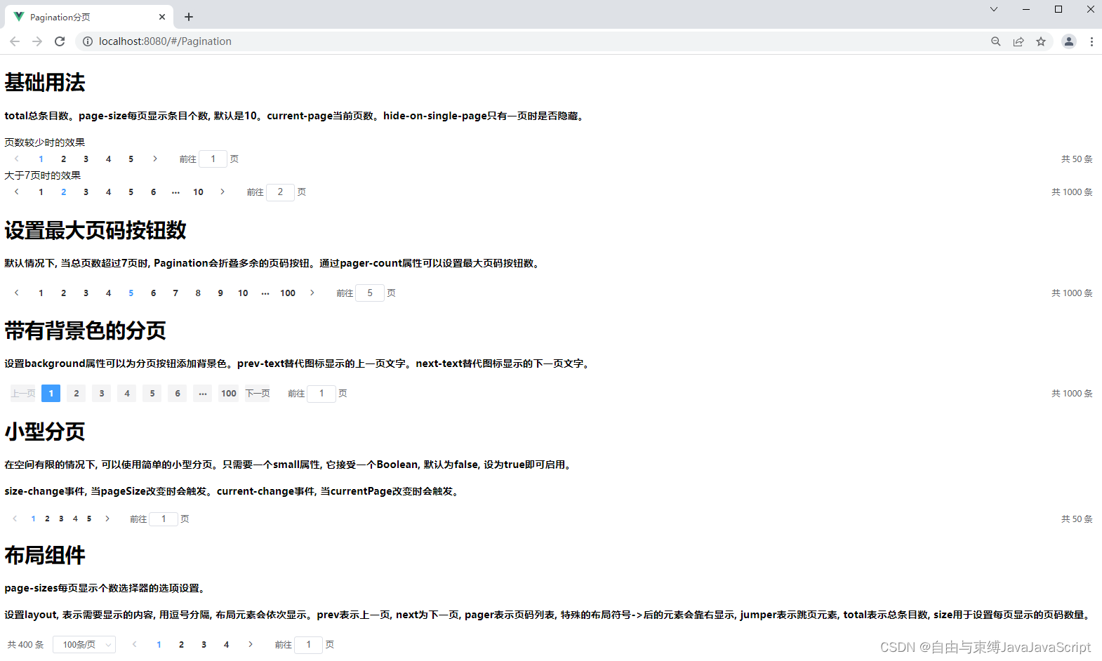<h4>设置layout, 表示需要显示的内容, 用逗号分隔, 布局元素会依次显示。prev表示上一页, next为下一页, pager表示页码列表, 特殊的布局符号->后的元素会靠右显示, jumper表示跳页元素, total表示总条目数, size用于设置每页显示的页码数量。</h4>