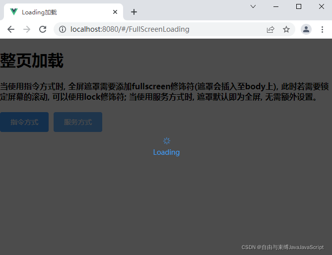 <el-button type="primary" @click="openFullScreen1" v-loading.fullscreen.lock="fullscreenLoading">指令方式</el-button>