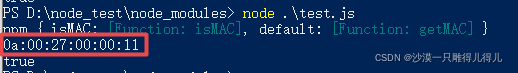 安装完毕会在node_modules文件夹下发现一个getmac文件夹,进入到node_moudles文件夹内,编写我们自己的test.js测试代码,如下所示: