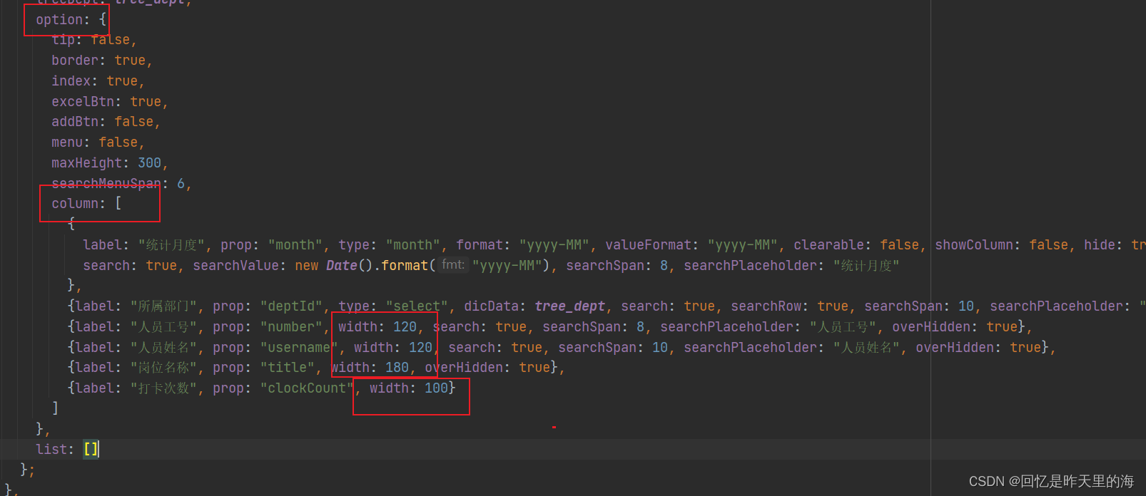 2.此时操作列没有了,但是可能会变成一个空列,那可能是你option里的column中的lable设置了width,此时把这些width都去掉,让框架自适应宽度就可以消除空列,如图