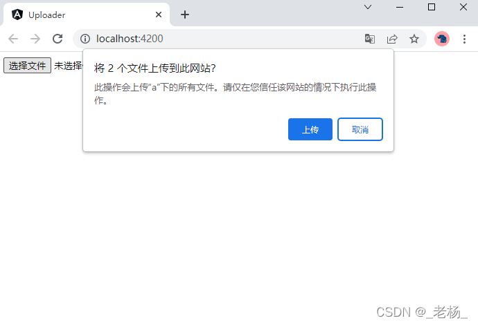 ? ? ? ? 这里如果 input 标签没有添加?webkitdirectory 属性,就不会有上传按钮,取而代之的是打开按钮,只能打开文件夹进行文件选择,而不能选中文件夹进行上传。选中文件夹a点击上传,会出现上传提示: