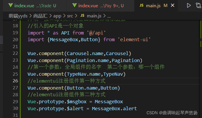 src文件夹(程序员源代码文件夹): ? ? -assets文件夹:一般也是放置静态资源(一般放置多个组件共用的静态资源),需要注意,放置在assets文件夹里面的静态资源,在webpack打包的时候,webpack会把静态资源当做一个模块,打包JS文件夹里 ? ? -components文件夹:一般放置非路由文件(全剧组件) ? ? -App.vue:项目中唯一的根组件,Vue当中的组件(.vue) ? ? main.js:程序入口文件,整个程序的中最先执行的文件