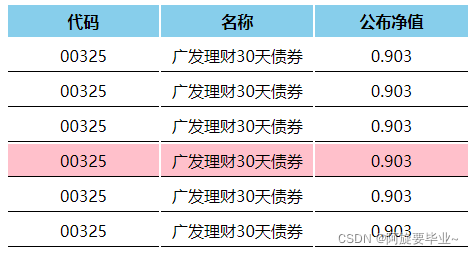 <td>00325</td><td>广发理财30天债券</td><td>0.903</td>