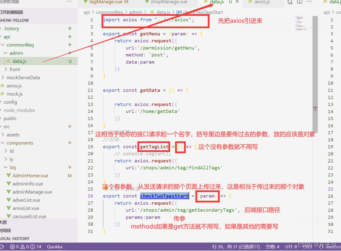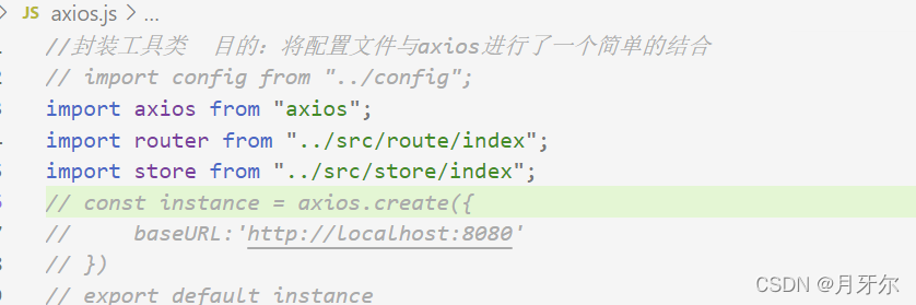 npm下载axios,在axios.js文件里引入axios包。(router与store分别存储的路由与token,在拦截器处理请求的时候需要用到)