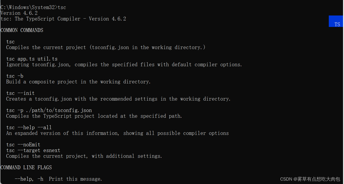 ?输入tsc? 如果能弹出一大堆东西,那就证明TypeScript安装成功了