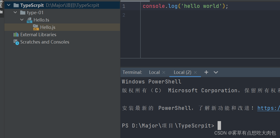 ?在项目控制台中输入:? ? tsc Hello之后按Tal键? ? 会自动补全,然后回车(Enter)