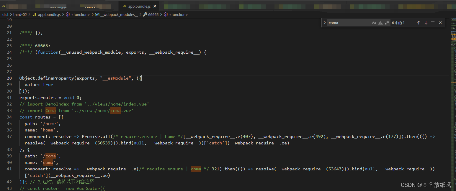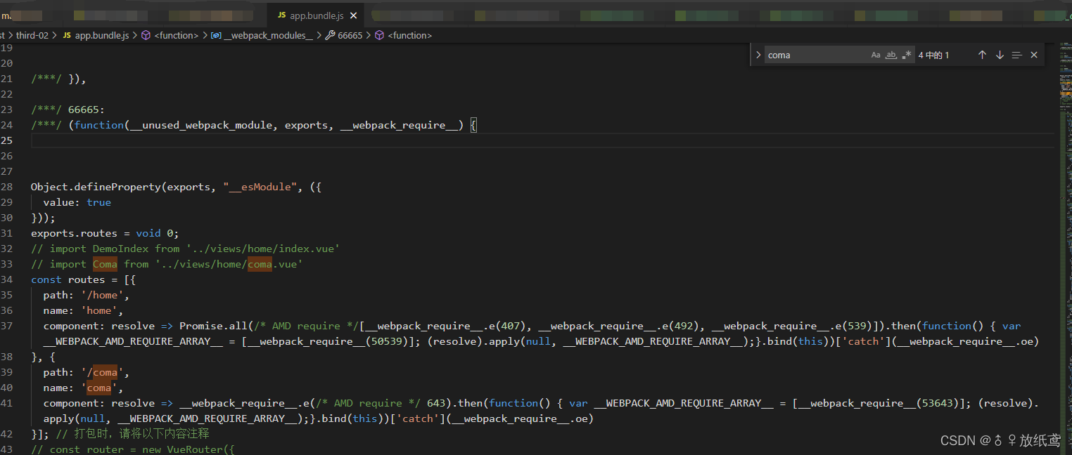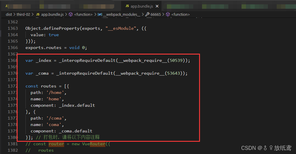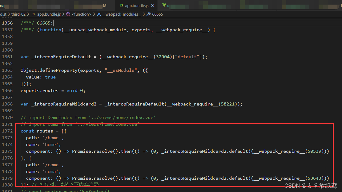 ?可以确定的是这种方式是异步加载组件,app.bundle.js中具体的路由代码,如下图