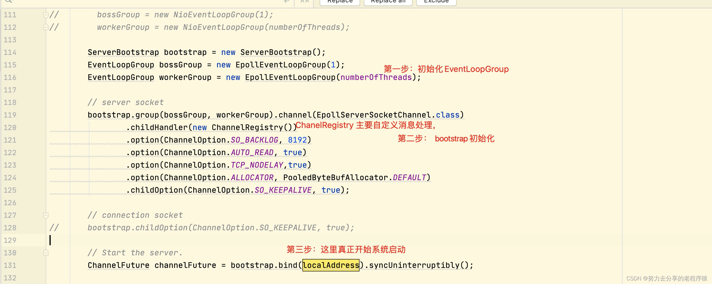 ServerBootStrap 的启动过程,主要有一些几步,每步骤的具体实现我们会在接下来的文章中一一介绍