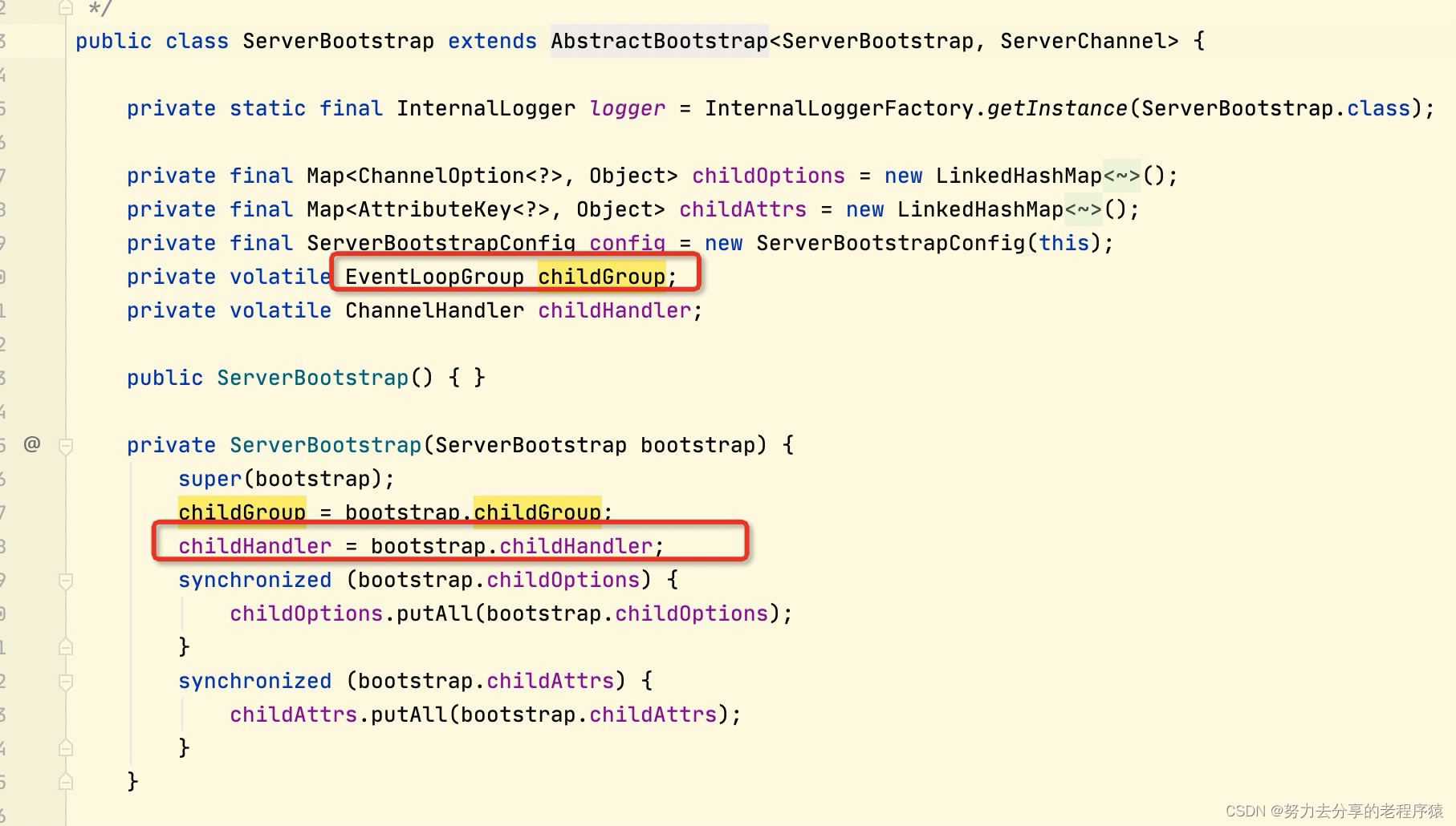 从 ServerBootStrap 的构造方法我们可以看出,该类主要用来进行参数配置,其中包括两个