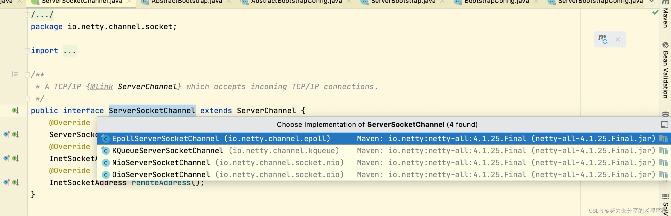 ?源码可以看到Channel是一个类的类型,在Netty 中主要有一下几个ServerSocket类型,接下来我们也主要会围绕这几种类型进行详细的源码解读。