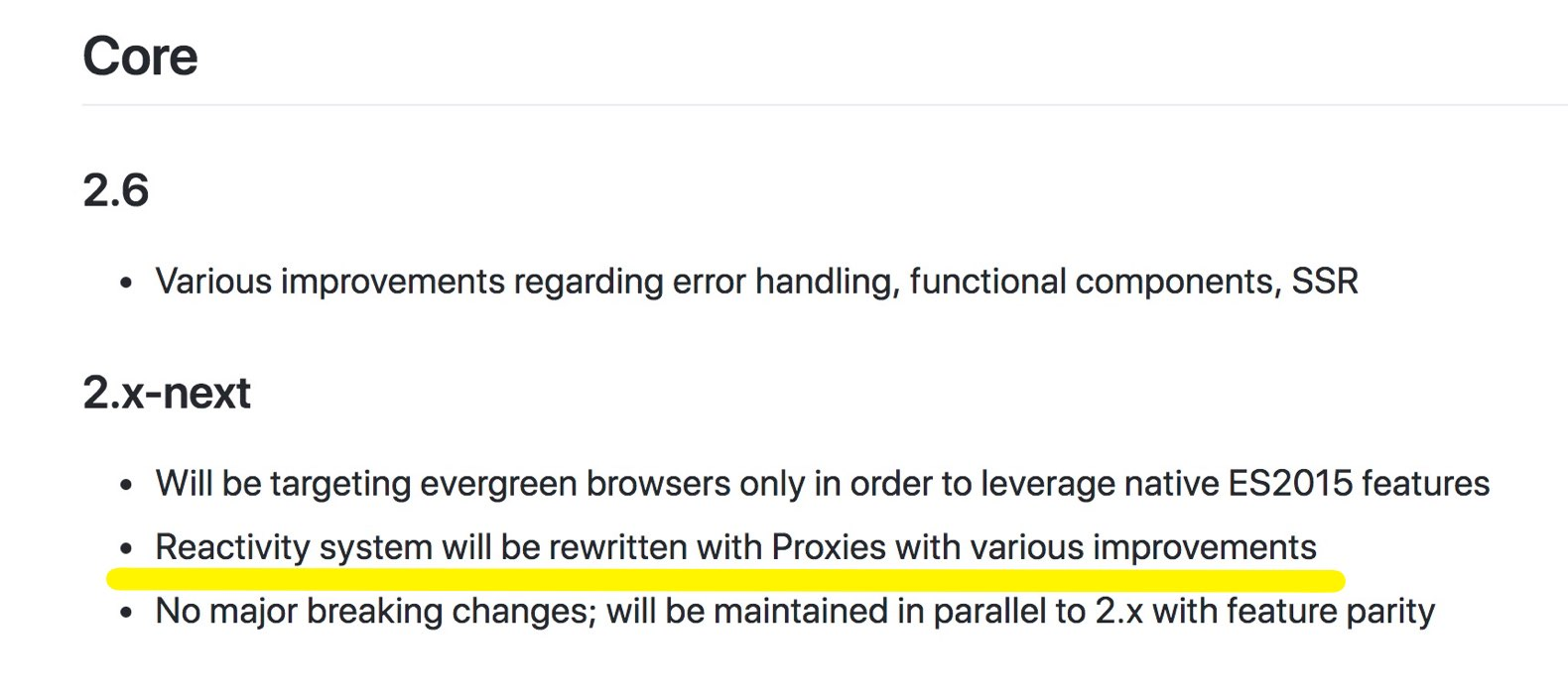 在上节课程中,我们建立了一个与vue响应式实现相类似的响应式系统。Object.defineProperty()的使用将属性转化为getter, setter方法,这样能够持续追踪依赖,在属性修改的时候能重新运行匿名函数代码。 如果你有关注过vue的设计蓝图,你会发现vue 2.x 以上的版本用proxy重写过,与我们上节课所展示的不同。  我在这里问了evan (尤雨溪 vue 创始人), 使用proxy重写到底是怎样实现的,重写的好处又在哪里呢?