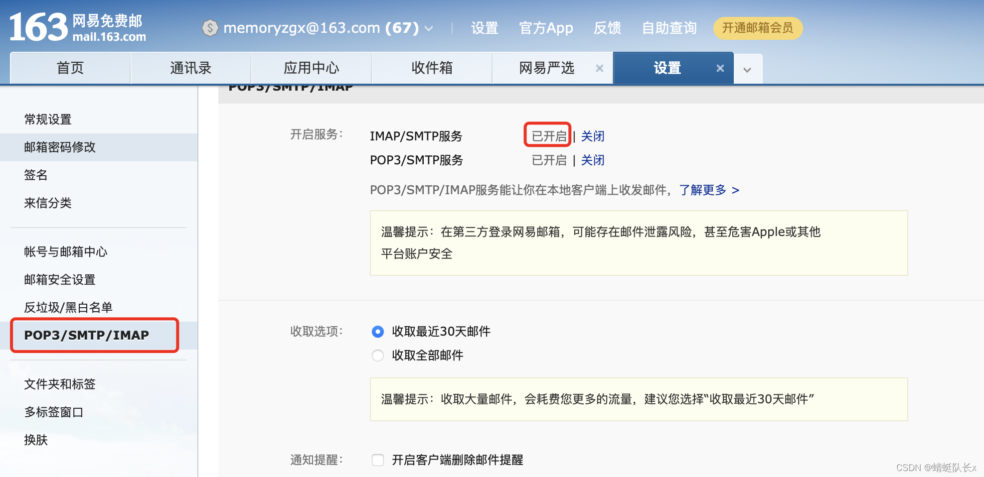 在设置中开启IMAP/SMTP 和 POP3/SMTP服务  在点击开启时,会让你发送一个短信,验证你的身份,可以快速扫码发送即可,此时就会给你返回一个授权码,此授权码只显示一次,保存好  重要: 如果有的账户,服务默认就是开启的,此时你也不知道你的授权码时多少,怎么办呢? 删除以下授权码,关闭服务,然后重新开启即可