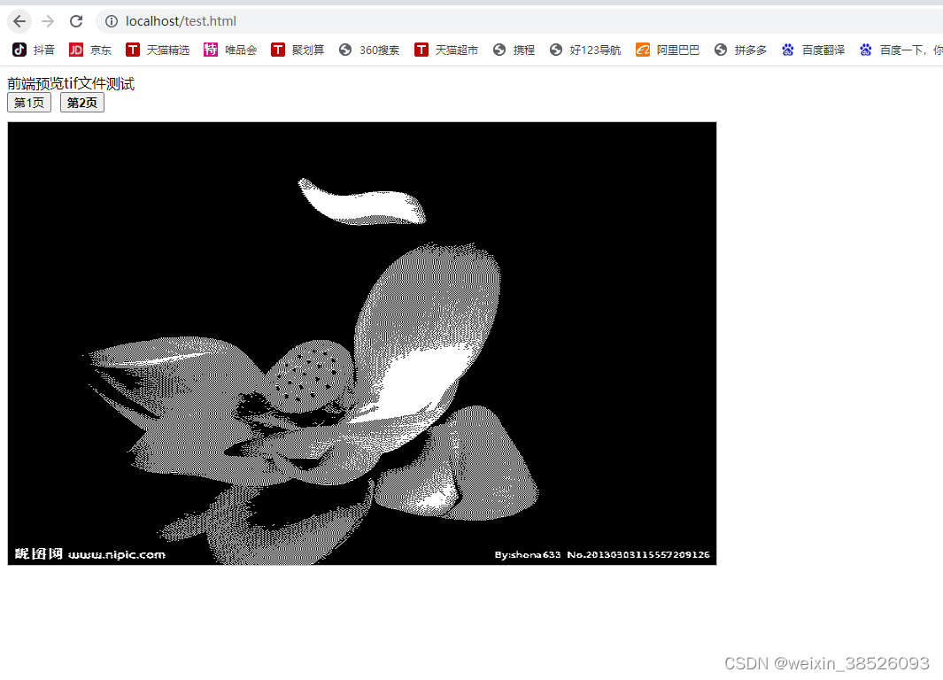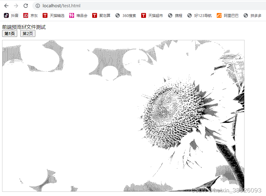 <html> <meta charset="utf-8" /> <script src="tiff.js"></script> <script> var xhr = new XMLHttpRequest(); xhr.responseType = 'arraybuffer'; xhr.open('GET', "http://localhost/1_2.tif"); xhr.onload = function(e){ ? Tiff.initialize({ TOTAL_MEMORY :100*1024*1024 }); ? var tiff = new Tiff({buffer: xhr.response}); ? //输出tiff文件数量 ? var canvasList = []; ? var buttons = []; ? var countDirectory = tiff.countDirectory(); ?? ? for(let i = 0;i < countDirectory;i++){ ?? ?tiff.setDirectory(i); ?? ?var canvas = tiff.toCanvas(); ?? ?canvasList.push(canvas); ?? ? ?? ?let button = document.createElement("INPUT"); ?? ?button.type = "button"; ?? ?button.value = "第"+(i + 1)+"页"; ?? ?button.style.cssText = "margin-left:"+i * 10 +"px;"; ?? ?button.addEventListener("click",(function(n){ ?? ??? ?return function(){ ?? ??? ??? ?for(let i = 0;i < buttons.length;i++){ ?? ??? ??? ??? ?buttons[i].style.fontWeight = "normal"; ?? ??? ??? ?} ?? ??? ??? ?buttons[n].style.fontWeight = "bold"; ?? ??? ??? ?var tiffcontainer = document.getElementById("tiffcontainer"); ?? ??? ??? ?tiffcontainer.innerHTML ?= ''; ?? ??? ? ? ?var canvas = canvasList[n]; ?? ??? ? ? ?canvas.style.width = tiffcontainer.clientWidth; ?? ??? ? ? ?canvas.style.height = tiffcontainer.clientHeight; ?? ??? ? ? ?tiffcontainer.append(canvas); ?? ??? ?} ?? ?})(i)); ?? ?document.getElementById("buttons").append(button); ?? ?buttons.push(button); ? } ?? ? buttons[0].click(); }; xhr.send(); </script> <body> 前端预览tif文件测试 <div id="buttons"> ?? ? </div> <div style="width:800px;height:500px;border:1px solid silver;margin-top:10px;" id="tiffcontainer">