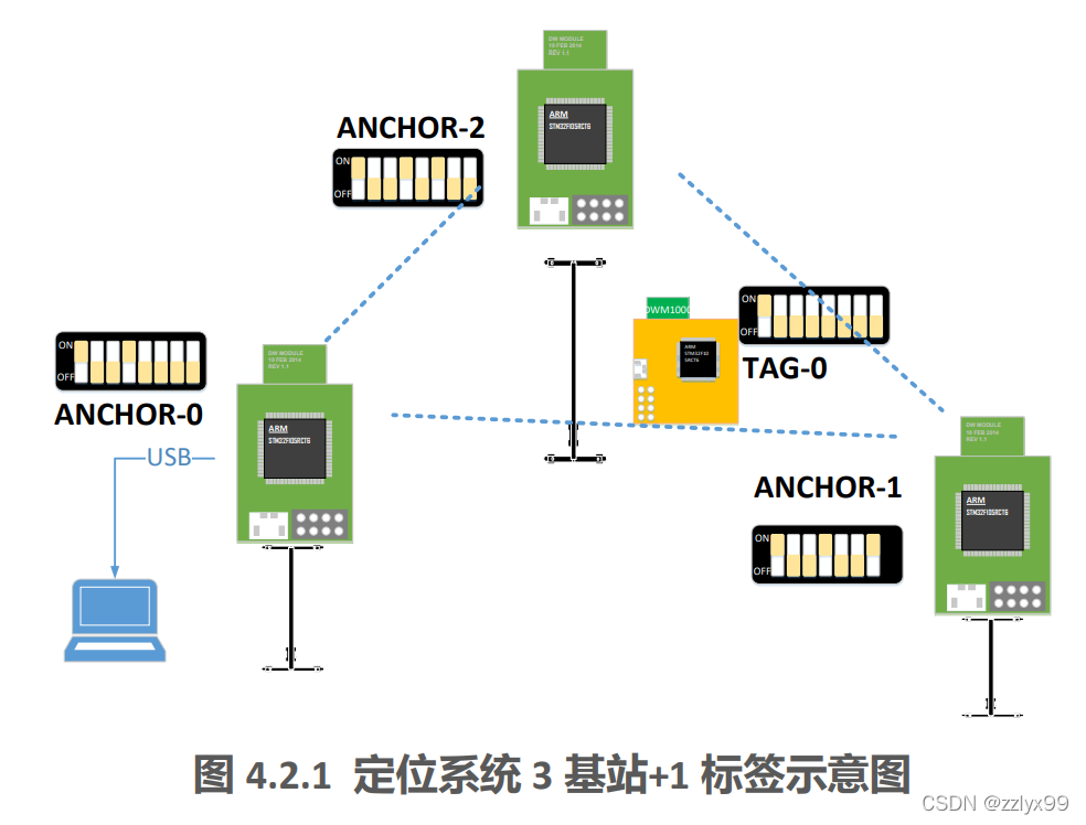UWB Mini 3 定位系统至少由四个 UWB Mini 3 模块组成,即 3 基站+1 标签。此后,可购买标签和基站,实现该系统标签和数量的扩展,该 DEMO 最大能支持 4 基站+8 标签。但是这不意味着这个系统最大只能支持 8 个标签,通过二次开发,能够支撑上万标签。