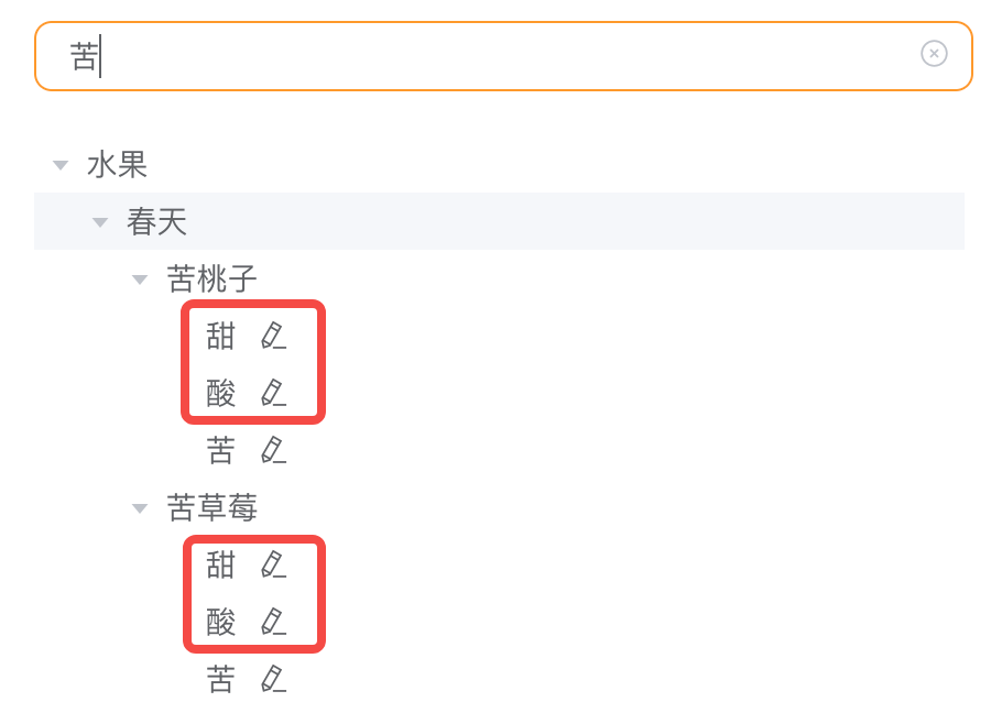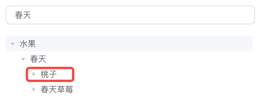 当搜索 “春天” 的时候,父子级都能匹配到,这个时候子级的支线节点 “桃子” 也会显示出来: