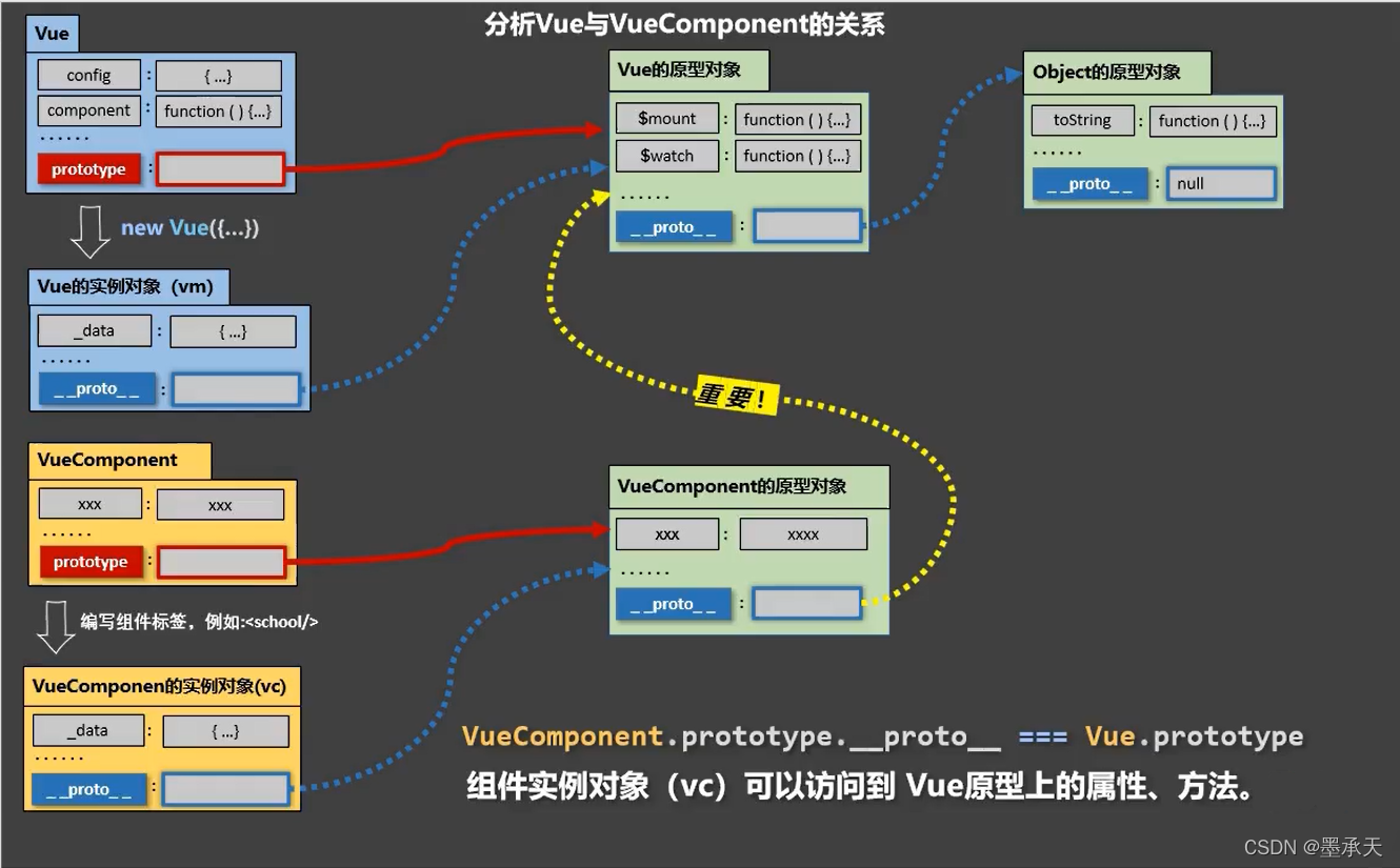- 为什么要有这个关系:让组件实例对象(vc)可以访问到 Vue原型上的属性、方法。