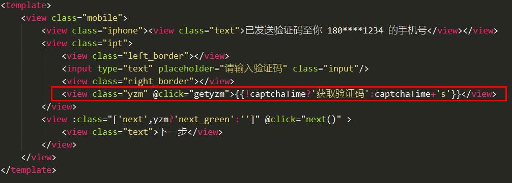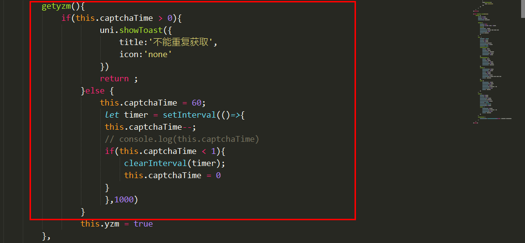 if(this.captchaTime > 0){ ?? ??? ??? ??? ??? ??? ?uni.showToast({ ?? ??? ??? ??? ??? ??? ??? ?title:'不能重复获取', ?? ??? ??? ??? ??? ??? ??? ?icon:'none' ?? ??? ??? ??? ??? ??? ?}) ?? ??? ??? ??? ??? ??? ?return ; ?? ??? ??? ??? ??? ?}else { ?? ??? ??? ??? ??? ??? ?this.captchaTime = 60; ?? ??? ??? ??? ??? ??? ? let timer = setInterval(()=>{ ?? ??? ??? ??? ??? ??? ? this.captchaTime--; ?? ??? ??? ??? ??? ??? ? // console.log(this.captchaTime) ?? ??? ??? ??? ??? ??? ? if(this.captchaTime < 1){ ?? ??? ??? ??? ??? ??? ??? ? clearInterval(timer); ?? ??? ??? ??? ??? ??? ??? ? this.captchaTime = 0 ?? ??? ??? ??? ??? ??? ? } ?? ??? ??? ??? ??? ??? ? },1000) ?? ??? ??? ??? ??? ?}