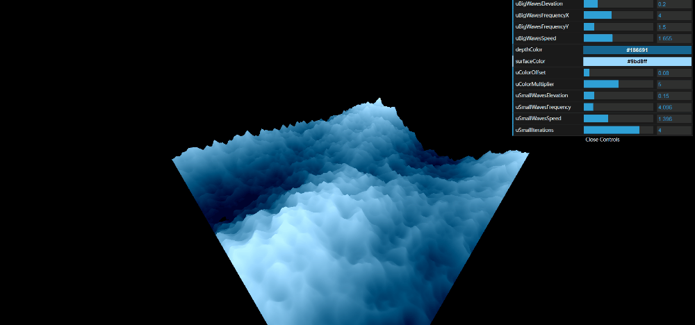 gui.add(waterMaterial.uniforms.uSmallWavesFrequency, 'value').min(0).max(30).step(0.001).name('uSmallWavesFrequency')