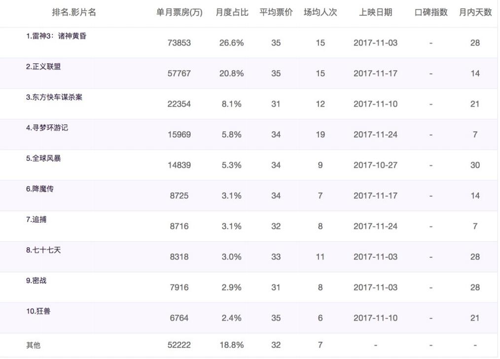 movie_name = ['雷神3:诸神黄昏','正义联盟','东方快车谋杀案','寻梦环游记','全球风暴','降魔传','追捕','七十七天','密战','狂兽','其它']