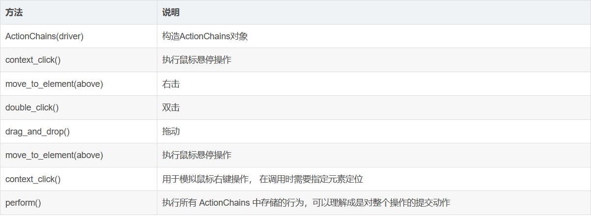 在 WebDriver 中, 将这些关于鼠标操作的方法封装在 ActionChains 类提供。