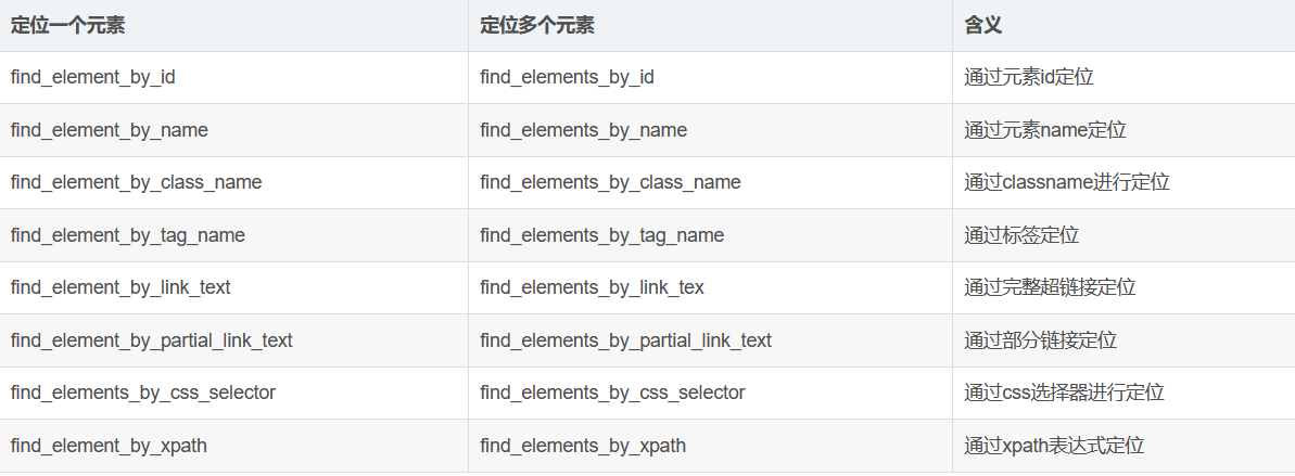 | 方法 | 说明 | | set_window_size() | 设置浏览器的大小 | | back() | 控制浏览器后退 | | forward() | 控制浏览器前进 | | refresh() | 刷新当前页面 | | clear() | 清除文本 | | send_keys (value) | 模拟按键输入 | | click() | 单击元素 | | submit() | 用于提交表单 | | get_attribute(name) | 获取元素属性值 | | is_displayed() | 设置该元素是否用户可见 | | size | 返回元素的尺寸 | | text | 获取元素的文本 |