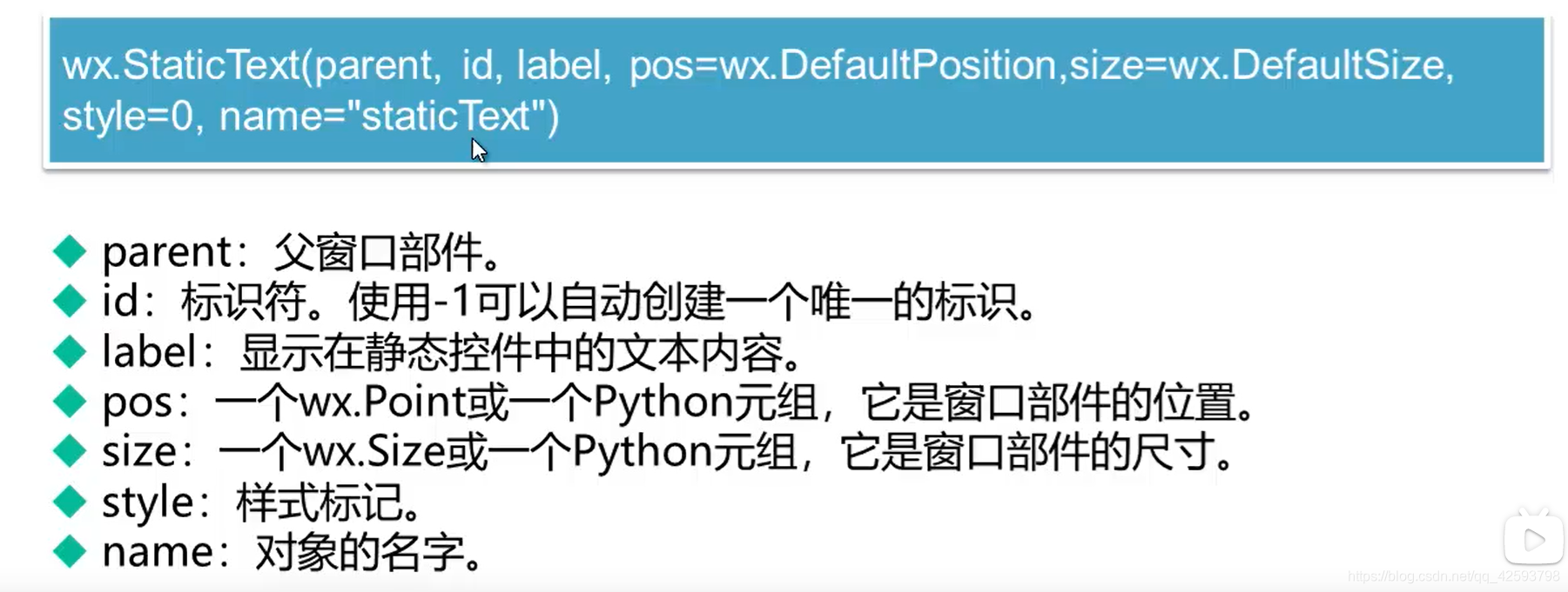 wx.Frame.__init__(self, parent, id, title="创建staticText", pos=(100, 100), size=(600, 400))