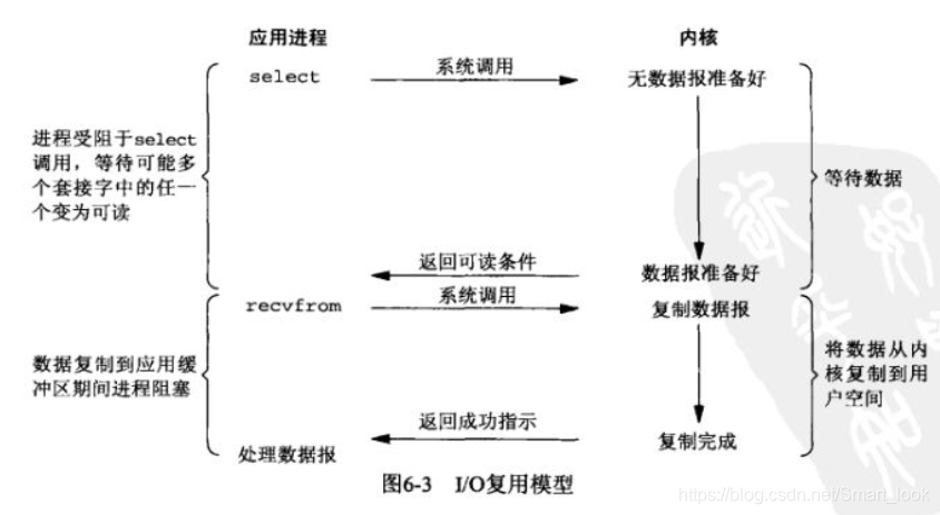 ?以select为例,将关注的IO操作告诉Select函数并调用,进程阻塞,内核“监视”select关注的文件描述符fd,被关注的任何一个fd对应的IO准备好了数据,select返回,再使用read将数据复制到用户进程