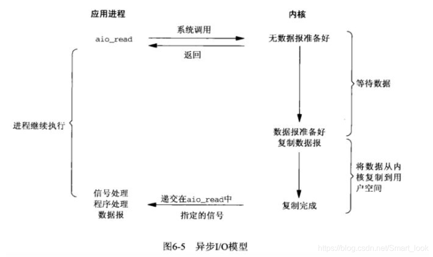 进程发起异步IO请求,立即返回。内核完成IO的阶段的两个阶段,内核给进程发一个信号。