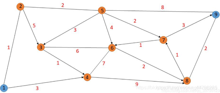 Dijkstra算法:求有向图一个顶点到另一顶点的最短路径。
