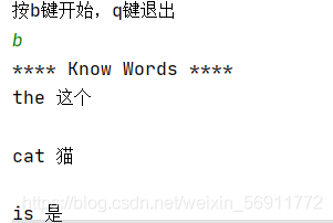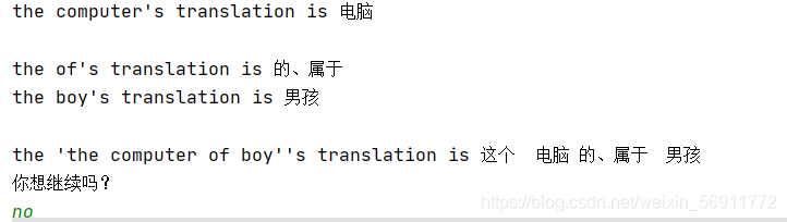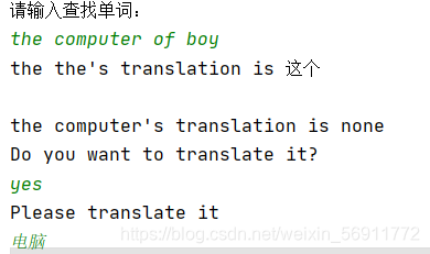 ?????????如上图所示,本词典实现的功能就是对多个词进行检索输出相应的翻译。当我们启动代码后,按‘b’键开始执行,会显示出词典已有的所有单词,即Know Words;然后提示输入查找单词,我们输入多个英文单词,如果词典已有,那么显示出翻译,如果没有,那么提示你是否翻译,之后我们查词人工翻译,词典自动记入翻译单词,下次检索就可以出现了。当然,我们检索中文也是可以的,如下图所示。