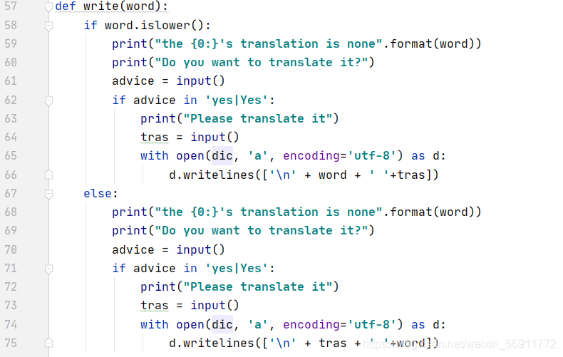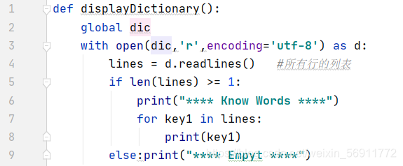 ? ? ? ? ?首先是词典的建立,在python语言中,类似于这种单词-翻译一对一的实现方法有很多,根据我目前想到的方法大致有python字典dic、文件file、类class、列表等四种方法。本次我选择的是文件file,利用文件储存单词和翻译,建立dictionary.txt文件,每一行放置一个单词和翻译,单词和翻译由空格隔开。此处我们就要注意在检索单词翻译时,不要忘了中间的这一空格‘\t’以及最后的‘\n’。