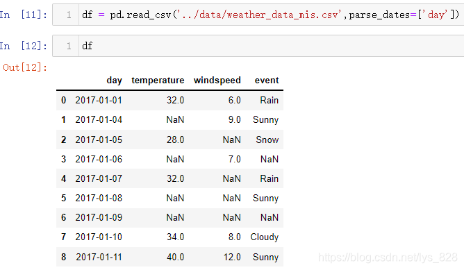 在实战中介绍这三种方式知识以及如何使用,首先加载数据,这里使用创建的天气数据  可以发现读取的数据中包含了时间,但是读入进来后Pandas默认将其当做了object数据(也就是字符串数据类型),因此可以在读入的时候使用parse_dates参数,指定要当做日期处理的字段名,数据读取完毕后,目标字段就会被自动解析为时间的数据类型