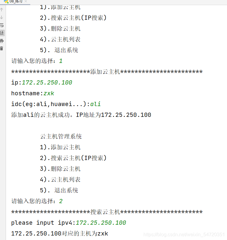 编写一个云主机管理系统: - 创建云主机(IP,hostname,IDC) - 搜索云主机(顺序查找) - 删除云主机 -查看所有云主机信息