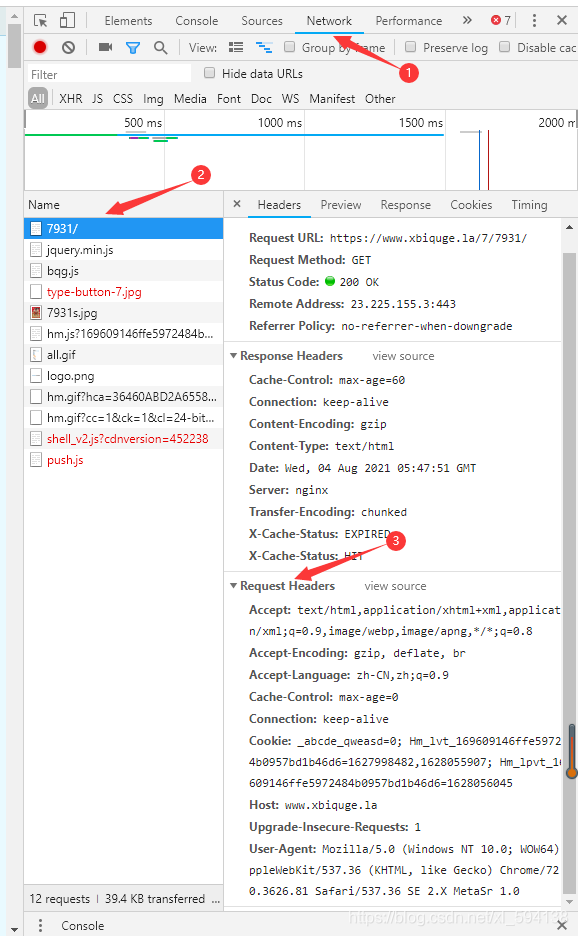 请求头的内容获取:F12键进入开发者模式,步骤如下图所示(未出现网站信息刷新一下页面就可以了)