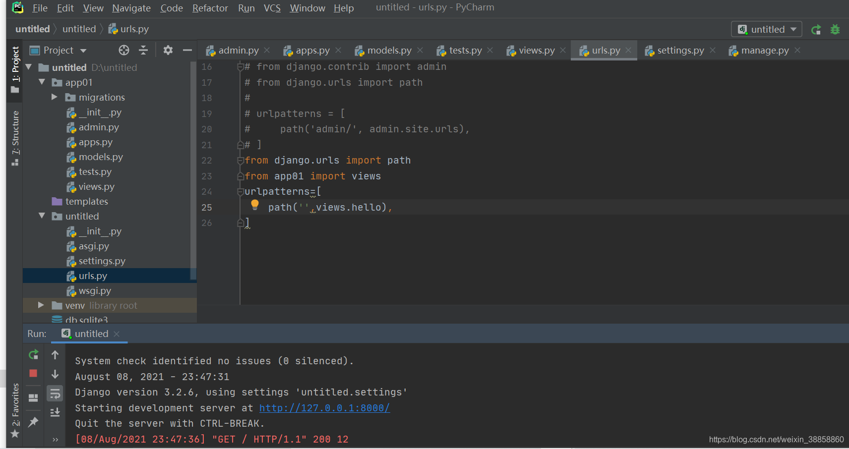 上面启动报错404 我的项目主要是修改url的path路径 :path('',views.hello),