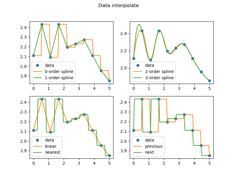 ‘zero’ 、‘nearest’ | 阶梯插值,相当于0阶B样条曲线 | ‘slinear’ 、‘linear’ | 线性插值,用一条直线连接所有的取样点,相当于一阶B样条曲线 | ‘quadratic’、‘cubic’ | 二阶和三阶的线性插值,更高阶的曲线可以直接使用整数值指定 |