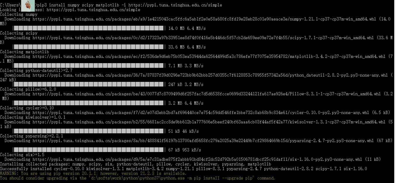 三、解决方法:在黑窗口执行cmd命令pip3?install?numpy?scipy?matplotlib?-i?https://pypi.tuna.tsinghua.edu.cn/simple