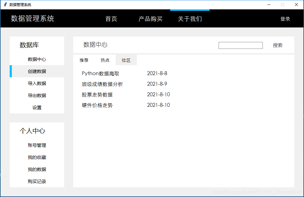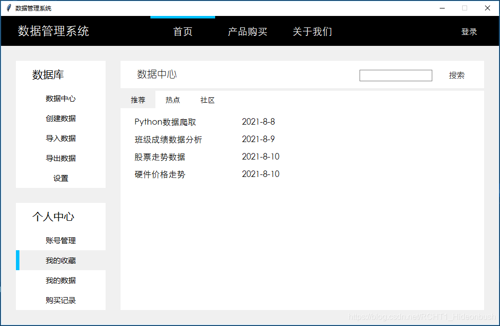left_button = ExButton(self.button_frame_1, height=40, width=180, text="数据中心", font=("微软雅黑", 11),