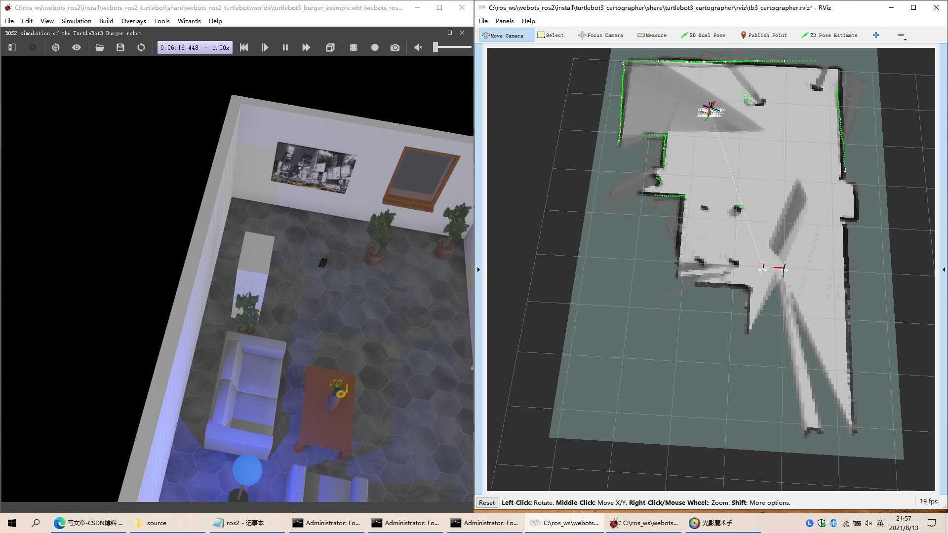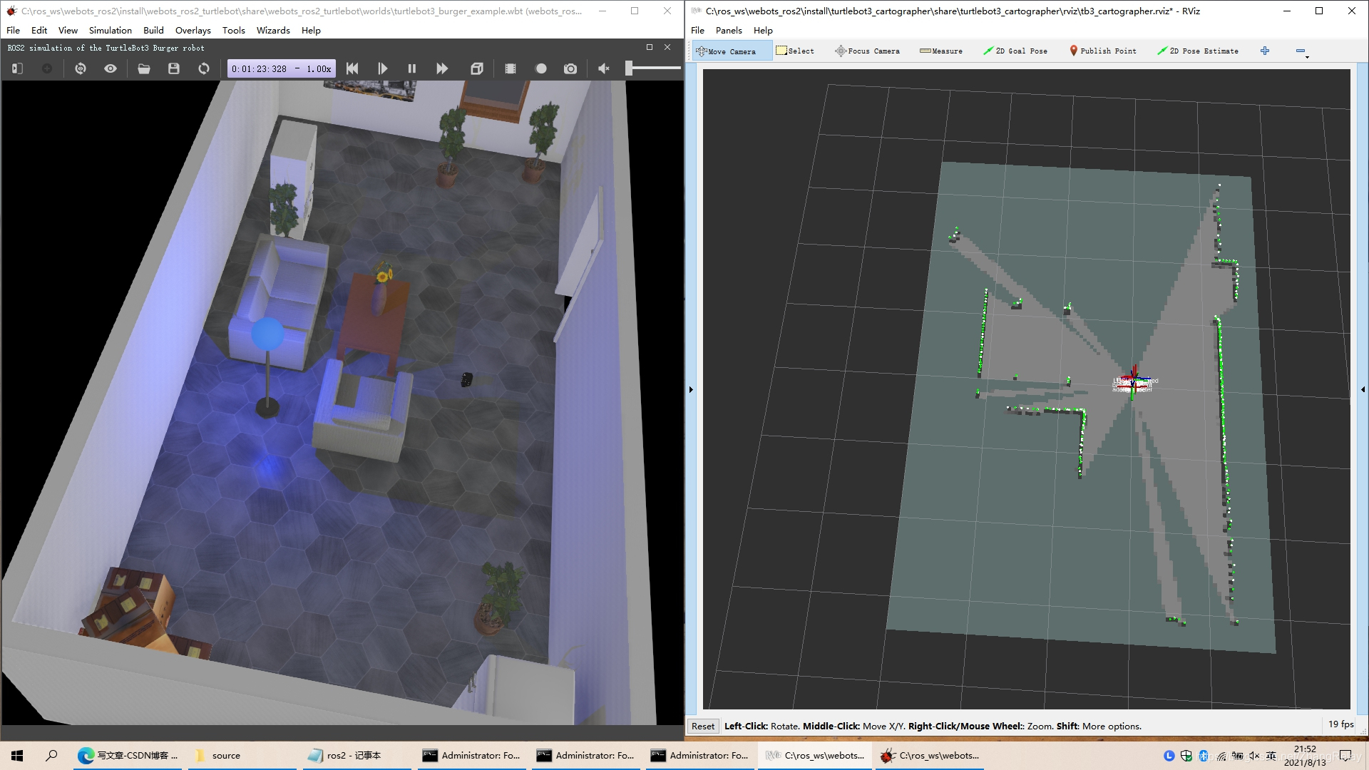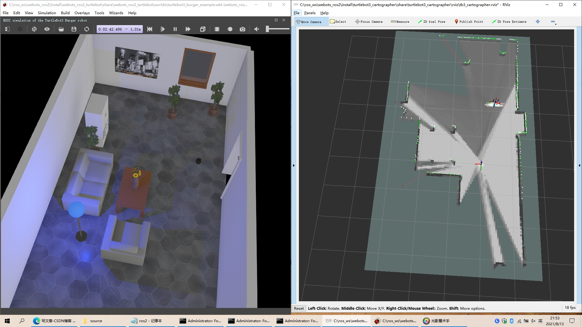 此处简单用turtlebot3+cartographer+ros2foxy+webots2021b在win10下,跑一个效果: