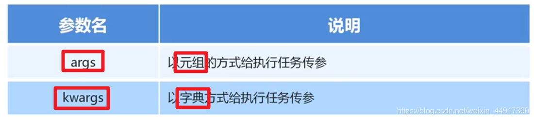 # kwargs:使用字典的方式给指定任务传参,名称一致(参数名称)