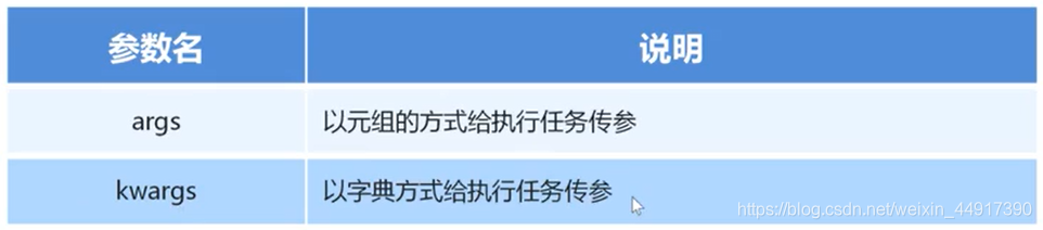 # args:使用元组方式给指定任务传参,顺序一致(参数顺序)