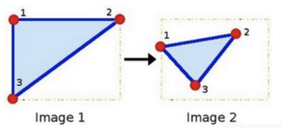 如下图所示,Image 1中的点1, 2 和 3 与Image 2中三个点一一映射, 仍然形成三角形,但形状已经大大改变,通过这样两组三点(感兴趣点)求出仿射变换, 接下来我们就能把仿射变换应用到图像中所有的点中,就完成了图像的仿射变换。