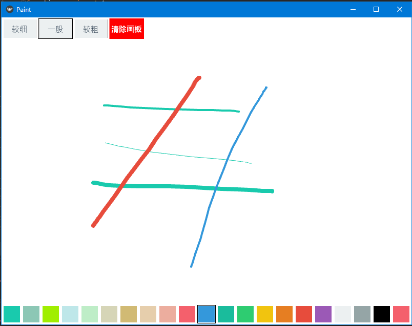 制作一款简易的调色画板,要用到的知识:页面布局、ToggleButton、ToggleButtonBehavior、get_color_from_hex(兼容十六进制编码颜色);功能上要可以选择颜色,选择画笔线宽,可以清除画板。具体实现效果如下: