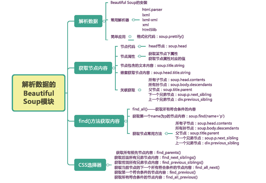 除了 find_all() 和 find() 方法可以实现按照指定条件获取节点内容以外,Beautiful Soup 模块还提供了多个其他方法,这些方法的使用方式与 find_all() 和 find() 方法相同,只是查询的范围不同,各个方法的具体说明可以查看官网:https://beautifulsoup.readthedocs.io/zh_CN/v4.4.0/#id27